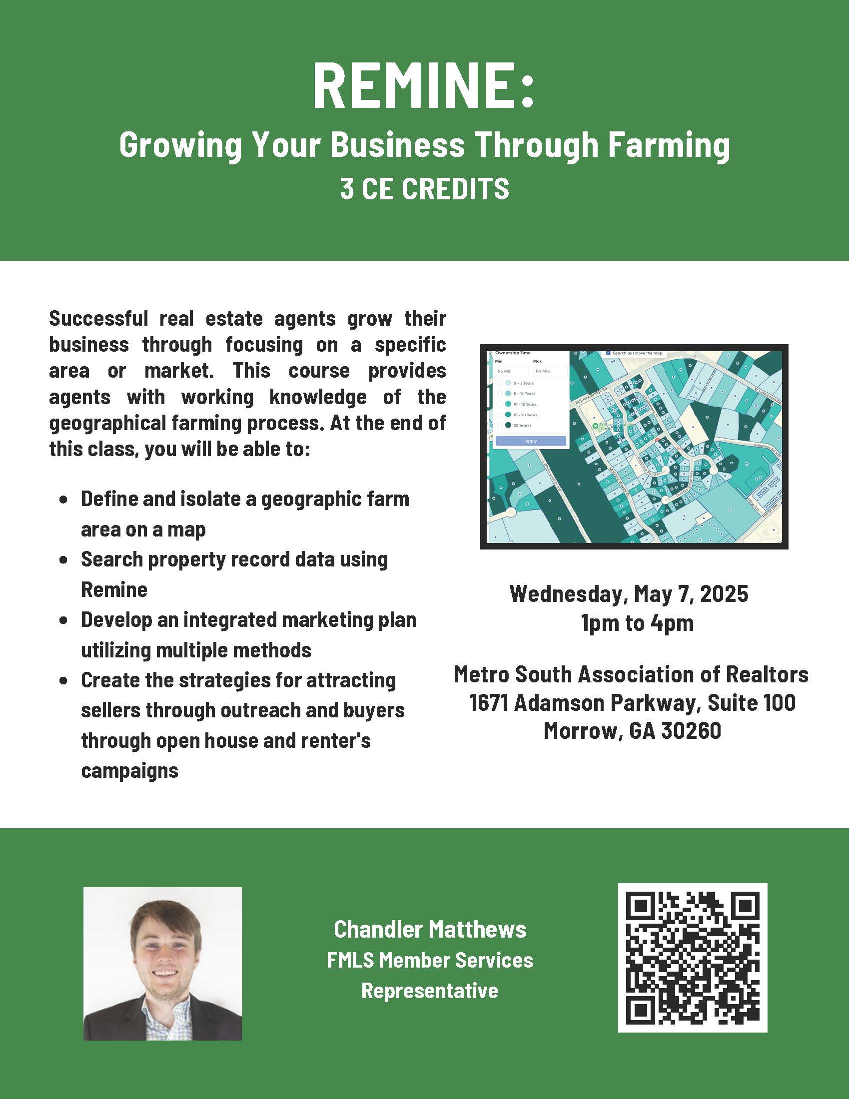 Successful real estate agents grow their business through focusing on a specific area or market. This course provides agents with working knowledge of the geographical farming process. At the end of this class, you will be able to: define and isolate a geographic farm area on a map, search property record data using Remine, Develop an integrated marketing plan utilizing multiple methods, Create the strategies for attracting sellers through outreach and buyers through open house and renter's campaigns.