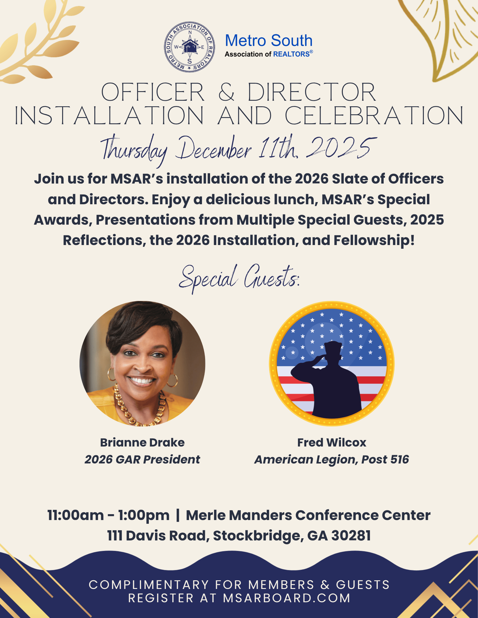 Join us for MSAR’s installation of the 2026 Slate of Officers and Directors. Enjoy a delicious lunch, MSAR’s Special Awards, Presentations from Multiple Special Guests, 2025 Reflections, the 2026 Installation, and Fellowship!