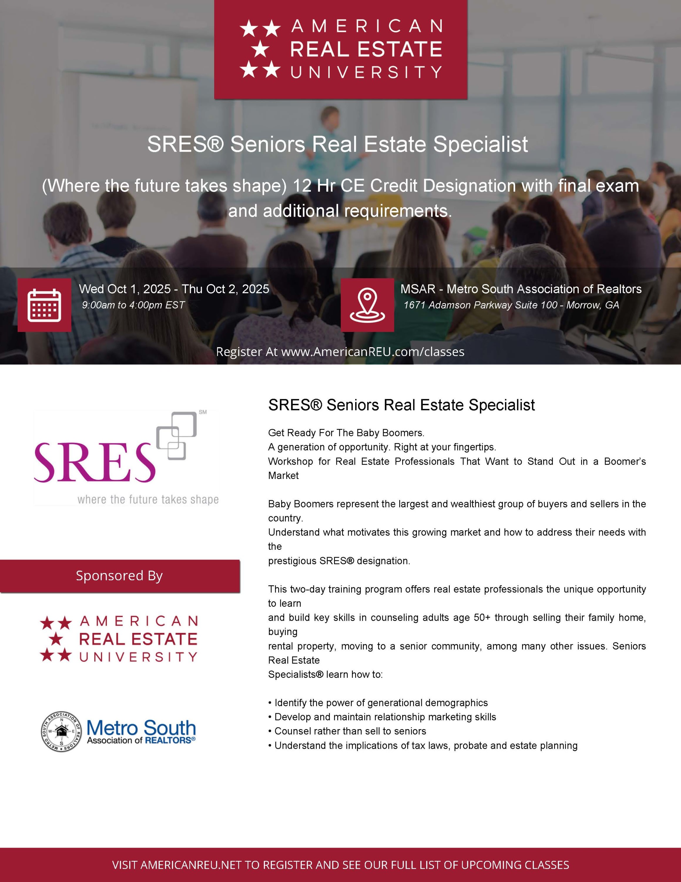Get Ready For The Baby Boomers. A generation of opportunity. Right at your fingertips. Workshop for Real Estate Professionals That Want to Stand Out in a Boomer’s Market Baby Boomers represent the largest and wealthiest group of buyers and sellers in the country. Understand what motivates this growing market and how to address their needs with the prestigious SRES® designation. This two-day training program offers real estate professionals the unique opportunity to learn and build key skills in counseling adults age 50+ through selling their family home, buying rental property, moving to a senior community, among many other issues. Seniors Real Estate Specialists® learn how to: • Identify the power of generational demographics • Develop and maintain relationship marketing skills • Counsel rather than sell to seniors • Understand the implications of tax laws, probate and estate planning