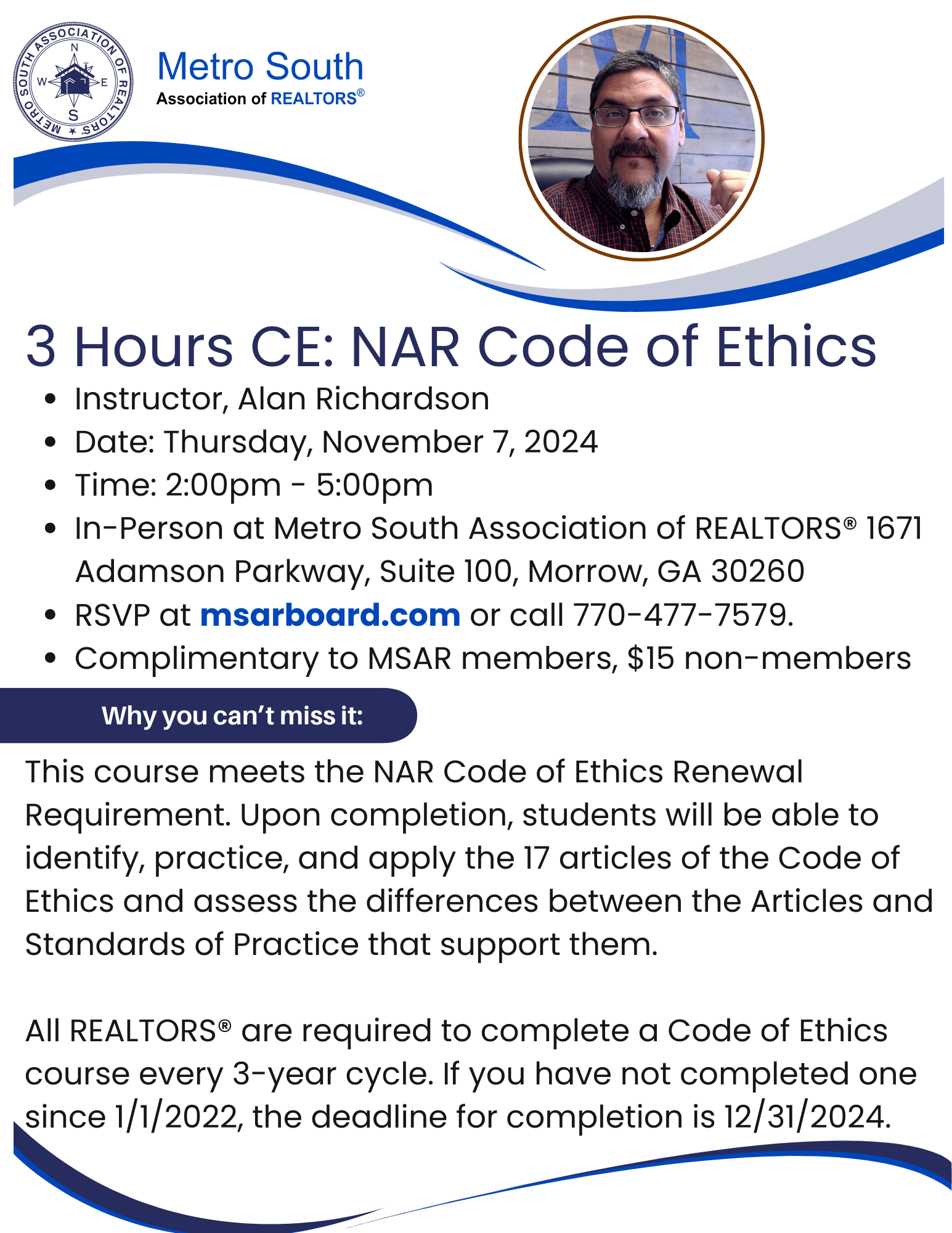 All REALTORS® are required to complete a Code of Ethics course every 3-year cycle. If you have not completed one since 1/1/2022, the deadline for completion is 12/31/2024.