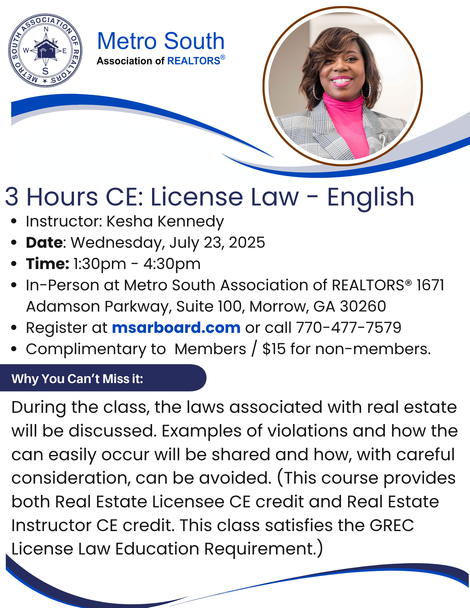 During the class, the laws associated with real estate will be discussed. Examples of violations and how the can easily occur will be shared and how, with careful consideration, can be avoided. (This course provides both Real Estate Licensee CE credit and Real Estate Instructor CE credit. This class satisfies the GREC License Law Education Requirement.)