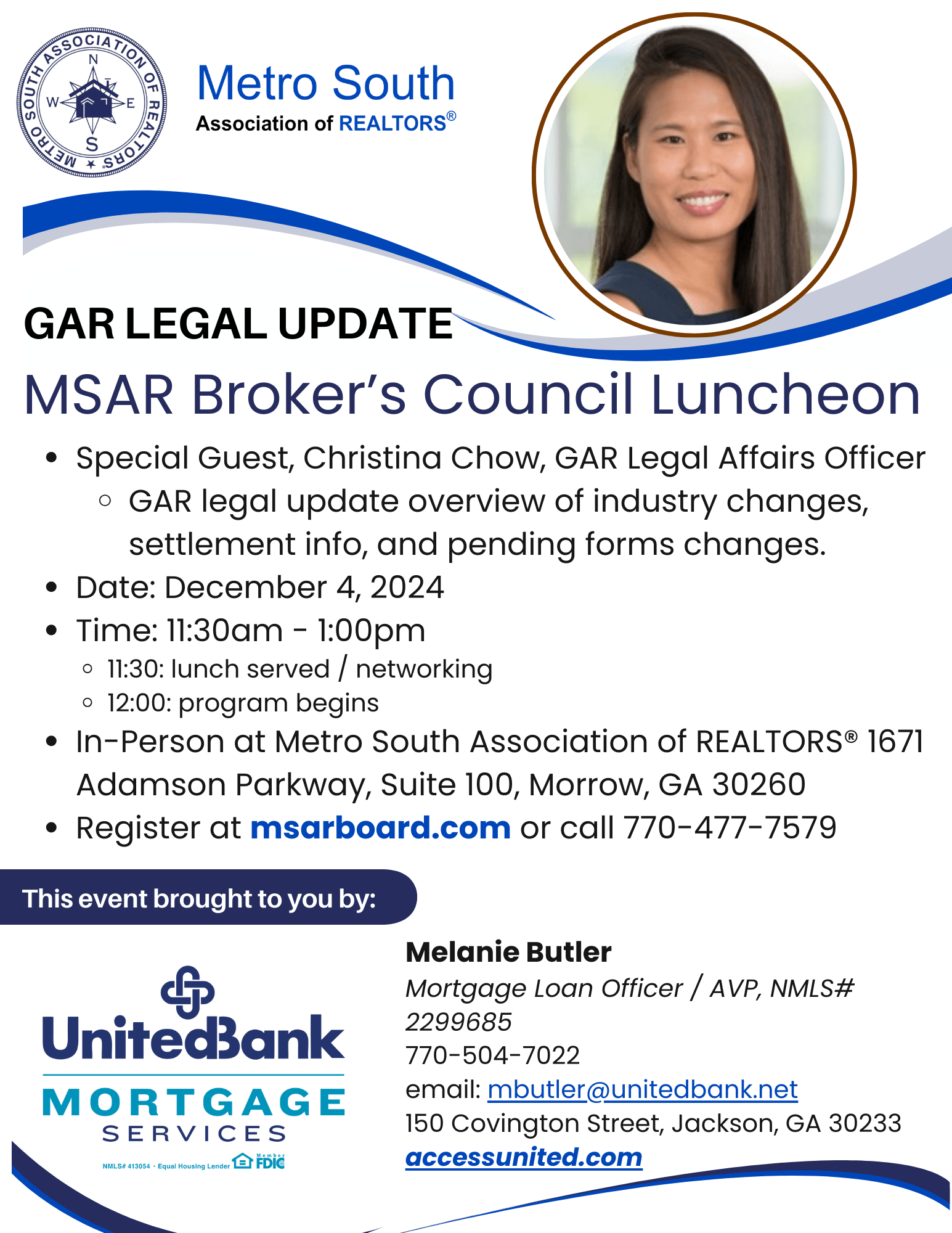Join MSAR's upcoming Broker's Council Luncheon. GAR's Legal Affairs Officer, Christina Chow, joins us to provide a general legal update and overview of industry changes, settlement information, and pending contract forms changes through the lens of a managing broker. This event is open to all Managing/Qualifying brokers, Associate Brokers, and Office Managers.
