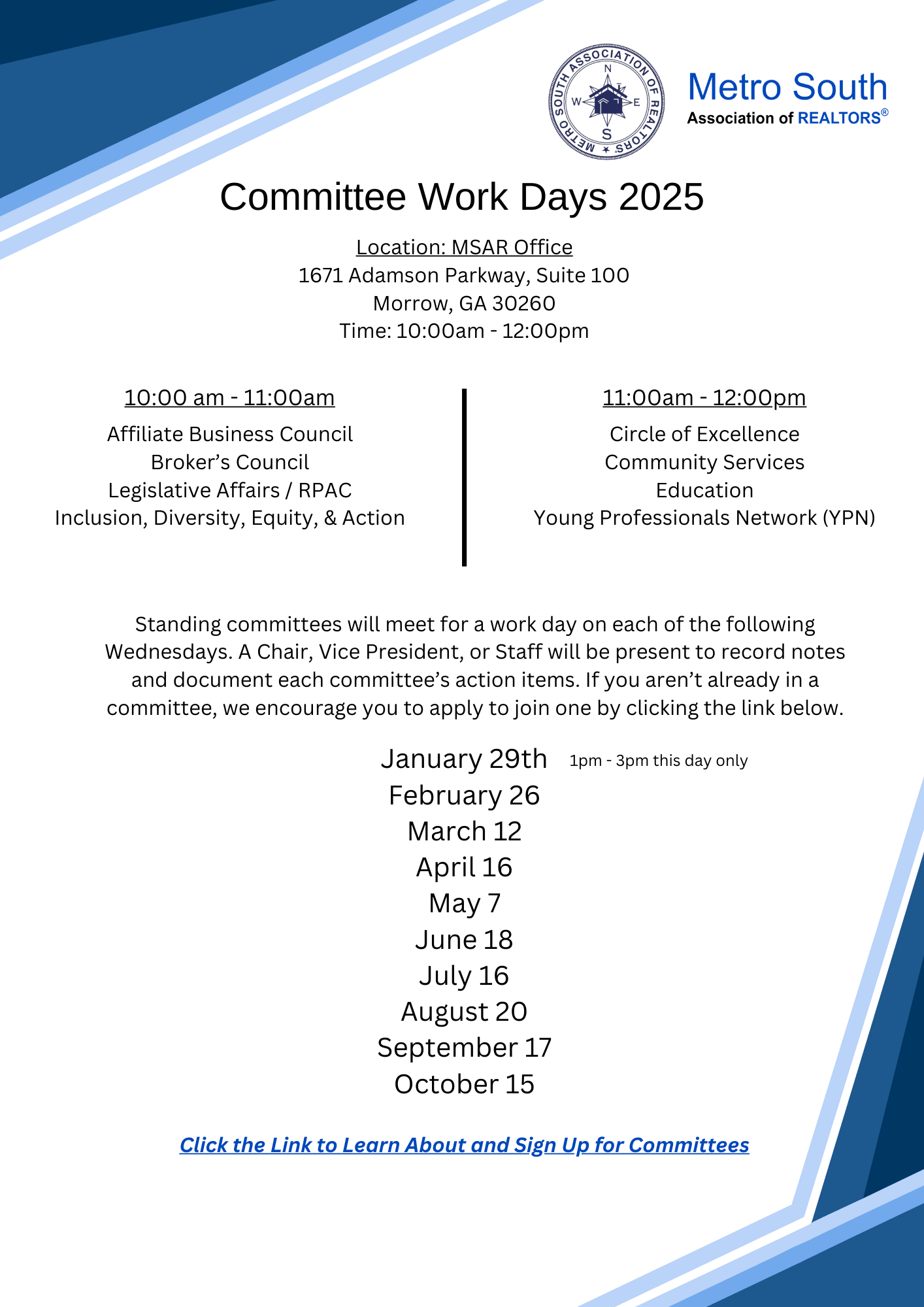 10:00am - 11:00am: Affiliate Business Council Broker's Council Legislative Affairs / RPAC Inclusion, Diversity, Equity, & Action 11:00am - 12:00pm: Circle of Excellence Community Services Education Young Professionals Network (YPN)