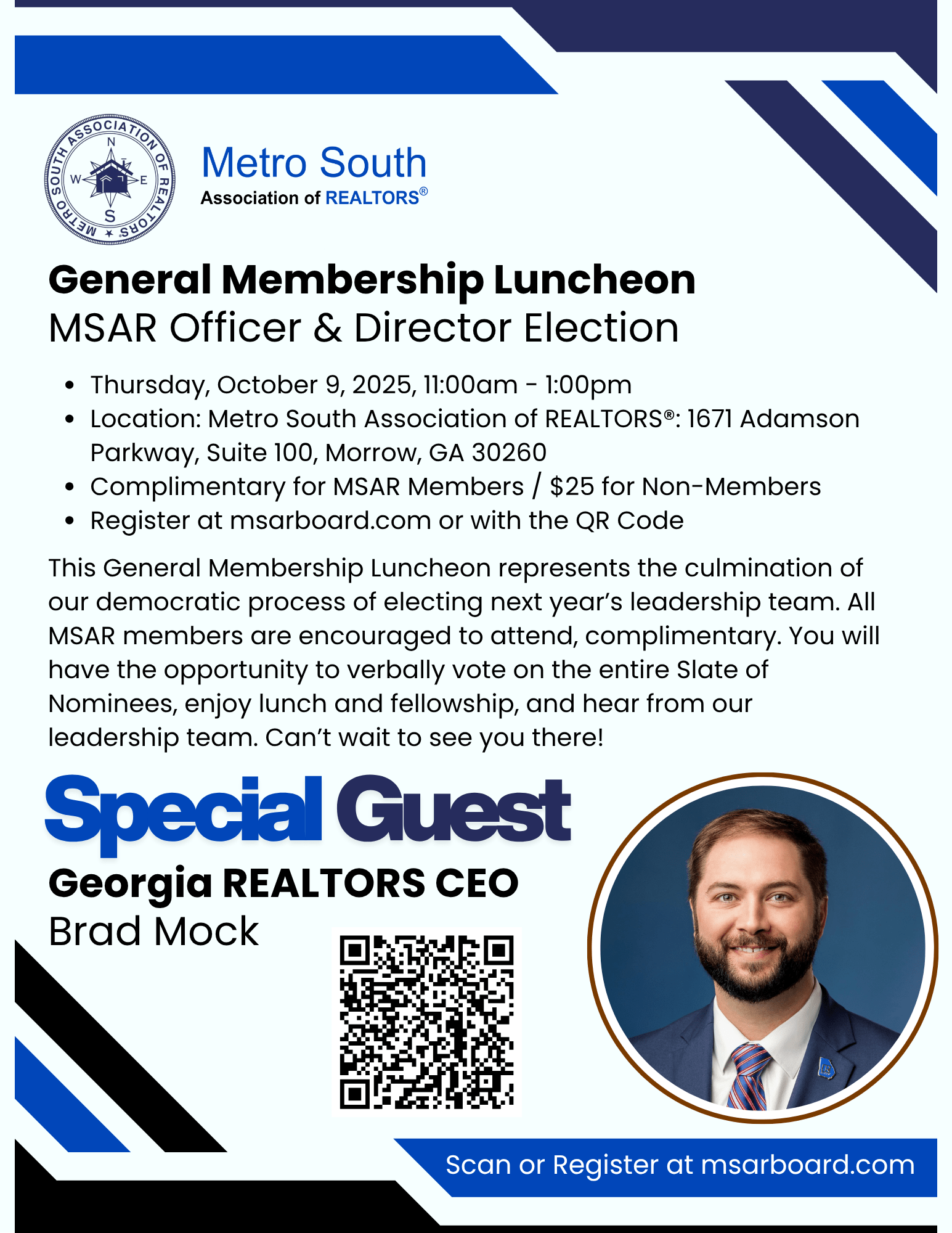 Special Guest: GAR CEO, Brad Mock. This General Membership Luncheon represents the culmination of our democratic process of electing next year's leadership team. All MSAR members are encouraged to attend, complimentary. You will have the opportunity to verbally vote on the entire Slate of Nominees, enjoy lunch and fellowship, and hear from our leadership team. Can't wait to see you there!
